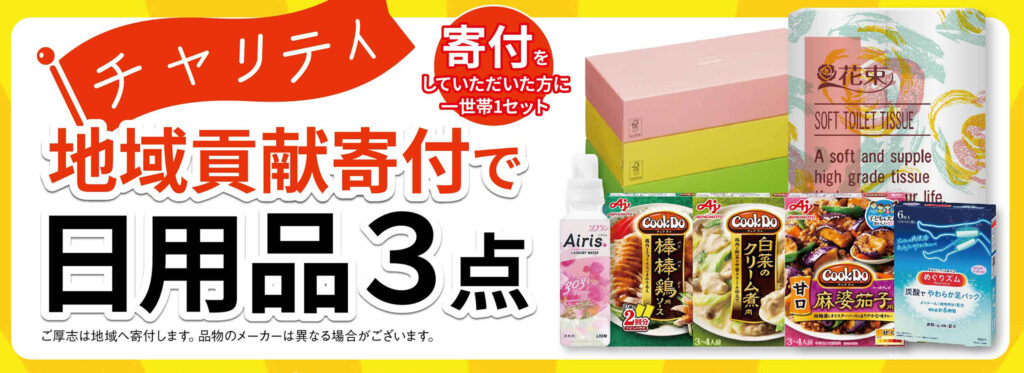 おなじみのアイテム大集合!地域貢献寄付で日用品3点をお得にGETできる、物価高騰の昨今にうれしい企画です。商品は数量限定、1世帯1セットまでとなっております。地域貢献をして、日々の生活に必要不可欠な日用品をお得にGETしましょう。