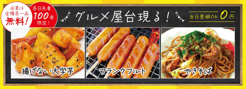 美味しいグルメ屋台を出店いたします。揚げない大学芋、フランクフルト、やきそばをお楽しみいただけます。さらに会員様・当日ご入会いただいた方は全種類が各一品無料。各日先着100食限定ですので、ご希望の方はお早めにお越しください。
