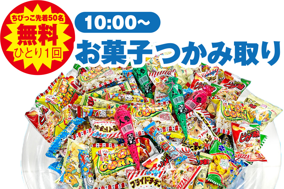 お子様大興奮の「お菓子つかみ取り」を開催します!お気に入りのお菓子をたっぷり掴んで、おやつの時間をさらにハッピーにしちゃいましょう!バラエティ豊かなお菓子をたくさんご用意してお待ちしております!