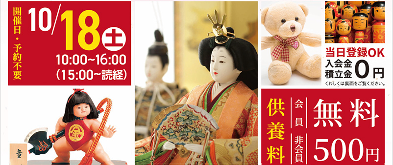 古くなったり壊れてしまっていても、大切な思い出の詰まった「ぬいぐるみ」「五月人形」「鯉のぼり」「鎧兜」など、お顔のついた愛着のある人形をお持ちください。地元住職を招いて大切に供養いたします。供養料一体500円、会員様は無料!