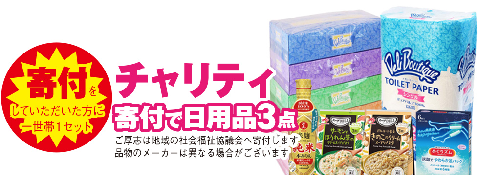 寄付をしていただいた方へ日用品3点をプレゼント!社会貢献もしながら、常備品としても役立つ日用品を手に入れるチャンスです。当日をお楽しみに!※画像はイメージです。