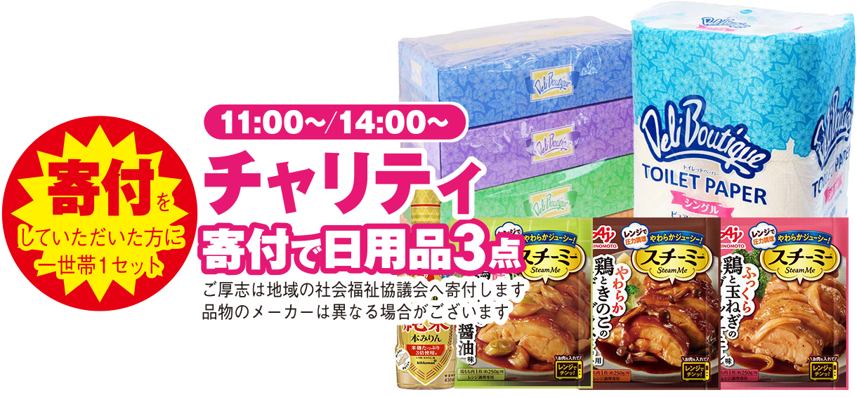 寄付をしていただいた方へ日用品3点をプレゼント!社会貢献もしながら、常備品としても役立つ日用品を手に入れるチャンスです。当日をお楽しみに!※画像はイメージです。