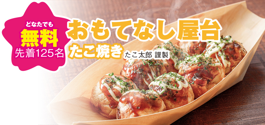 今回は「たこ焼き」をご用意いたしました!先着125名様に無料でプレゼント!腹ごなしにぜひお召し上がりください!