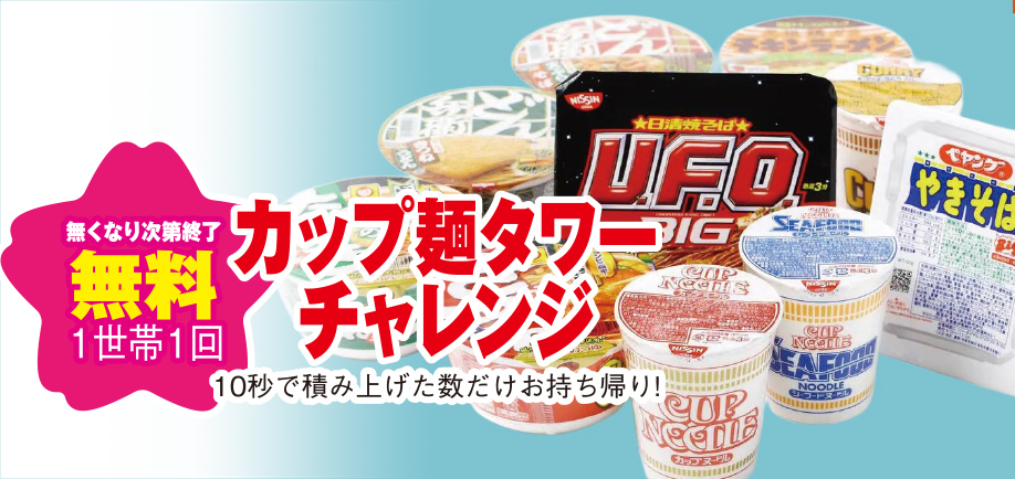 「カップ麺タワーチャレンジ」を開催!積み上げたカップ麺の数だけプレゼント!バランス感覚とスピードが勝負のカギ!おとなもこどもも楽しめるドキドキのチャレンジです!