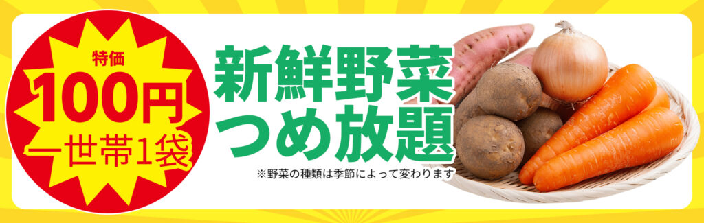 「新鮮野菜つめ放題」を1袋100円で実施いたします。1世帯につき1回まで。数に限りがございますので、なくなり次第終了となります。この機会に旬の味覚をお楽しみください!