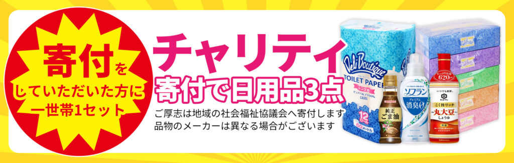 さらに寄付による日用品3点のプレゼントも実施いたします。地域の福祉協議会へ寄付していただいた方に、日々の生活に欠かせない品物をプレゼントいたします。1世帯1セットまで、物価高の昨今に嬉しいお得な企画ですので、お求めの方はお早めにお越しください!