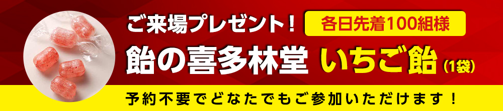 さらに当日は来場特典として、「飴の喜多林堂 いちご飴(1組1袋)」を各日先着100組様にプレゼントいたします。数に限りがございますので、なくなり次第終了とさせていただきます。お求めの方はお早めにご来場ください!