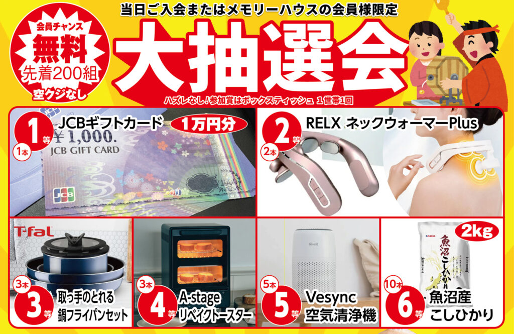 さらに豪華賞品が当たる大抽選会を開催いたします。会員様、または当日ご入会いただいた方は無料でご参加いただけます。1世帯1回まで、先着200組までとなっております。ハズレなしのお得な抽選会ですので、この機会にぜひご参加ください。
