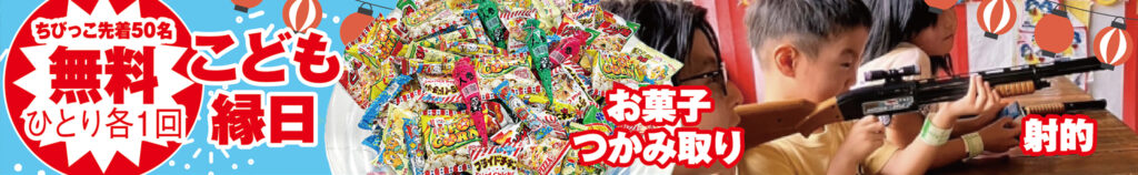 ちびっこ限定!先着50名様が無料でご参加いただける「こども縁日」を実施いたします!お菓子つかみ取りや射的など、楽しい催しをご用意しました。お一人様各1回までのご参加となります。ご家族そろって、ぜひお気軽にご参加ください。