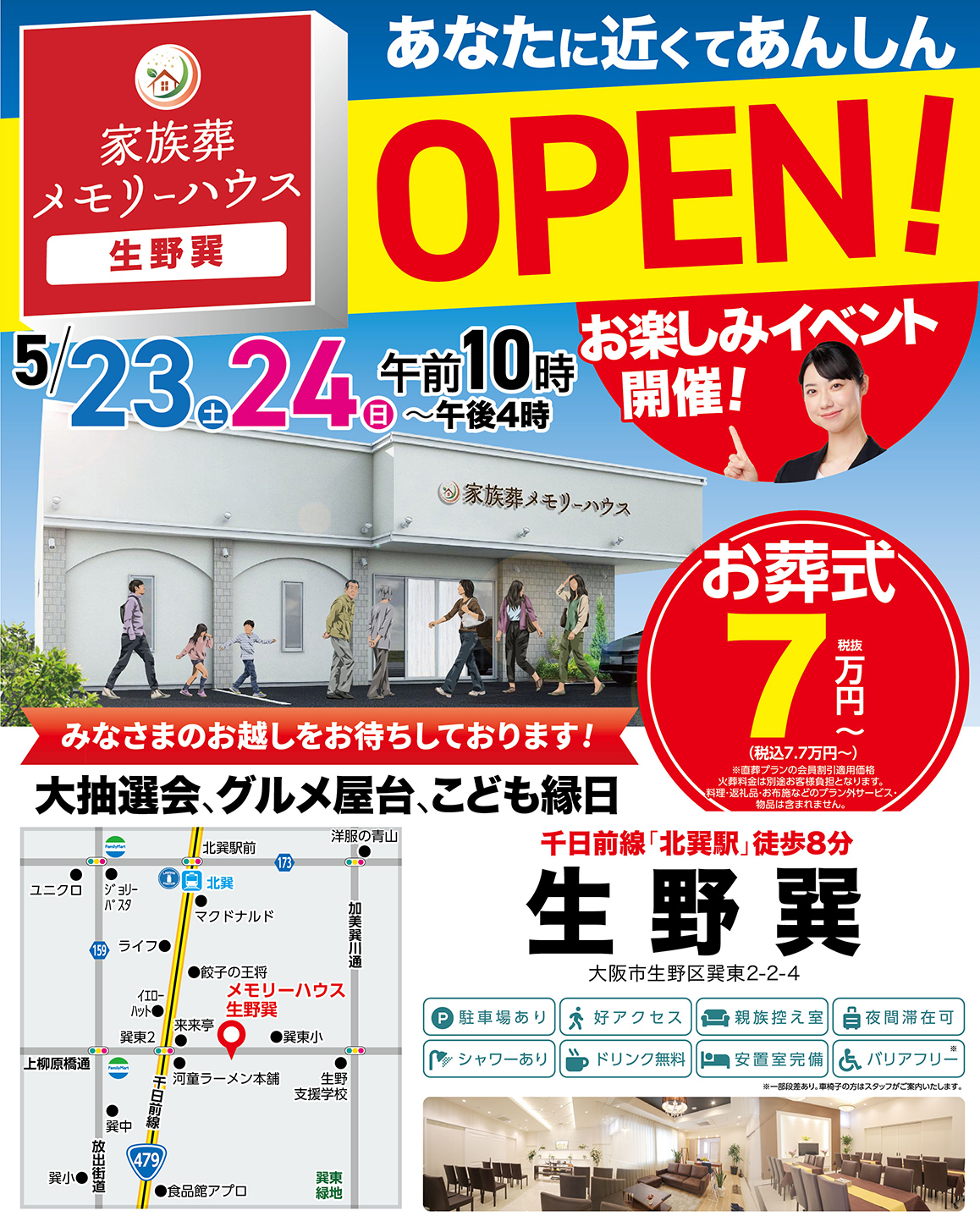 5月23日(土)、大阪市生野区に5店舗目となる生野巽がオープンします。オープンに際し2日間にわたって、大抽選会・グルメ屋台・こども縁日など、お得な企画を用意したお楽しみオープンイベントを開催いたします。予約不要でどなたでもご参加いただけますので、この機会にぜひご来館ください。