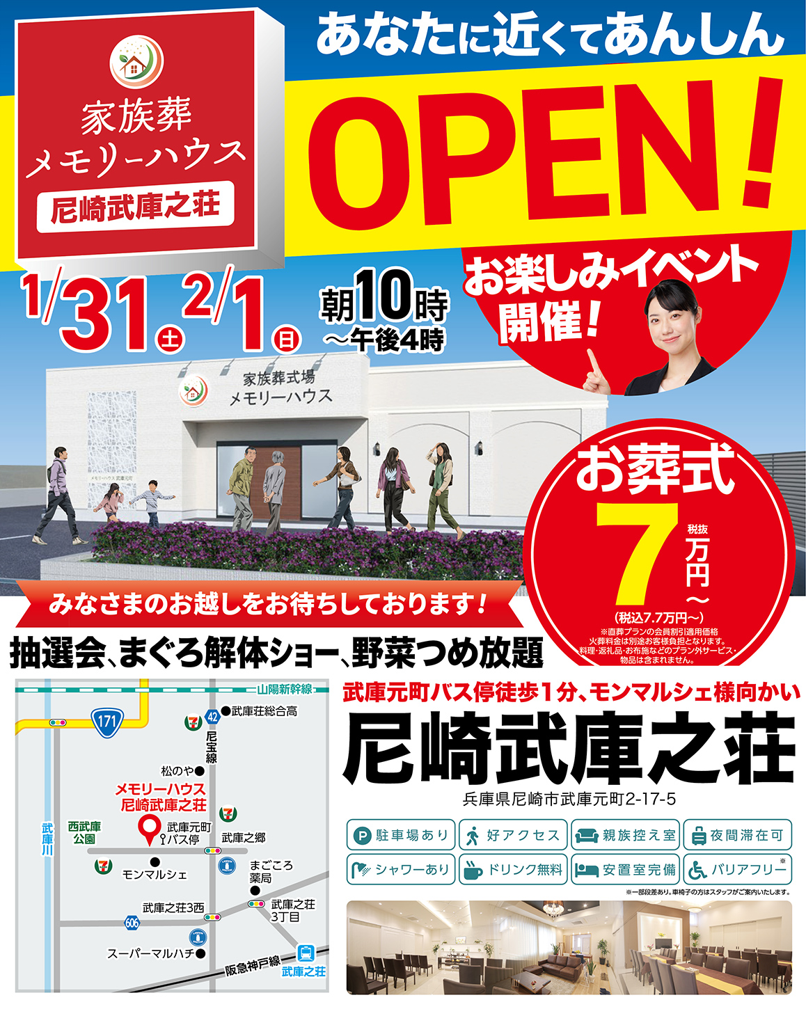 誰でも参加できる!家族葬メモリーハウス 尼崎武庫之荘オープンイベント 1月31日(土)、兵庫県尼崎市に初出店となる尼崎武庫之荘がオープンします。オープンに際し2日間にわたって、抽選会・まぐろ解体ショー・野菜つめ放題など、 […]