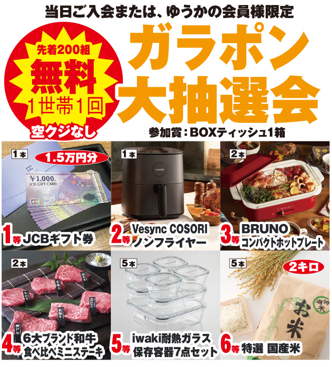 当日は会員様向けに豪華賞品が当たる大抽選会を開催いたします。当日【無料会員】に入会された方も対象となります!ハズレなしのお得な抽選会ですのでぜひご参加ください。